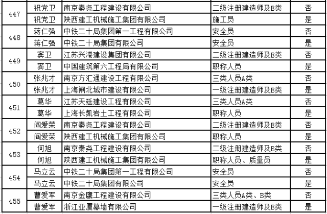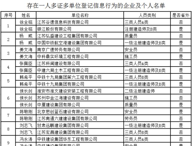 江苏省经建筑施工企业数据库查询,发现在多家企业报送的人员进省核验信息中,存在同一人持多本证书(注册建造师、三类人员、职称人员、岗位管理人员)在多家企业(省内、省外企业)登记信息的弄虚作假行为。另外,逾期整改不到位的,列入黑名单,禁入江苏建筑市场!